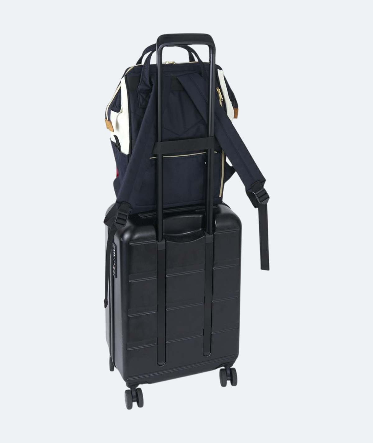 anello Cross Bottle Backpack is now more convenient with PC storage, security pockets, and a D-ring on the side. Features include a magazine holder, bottle holder, trolley sleeve, water resistance, and strong metal clasps, with eco-suede zip tips and decorative metal dots. Designed and quality-checked in Japan.