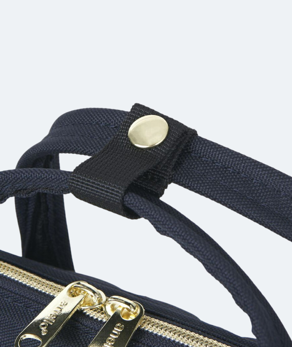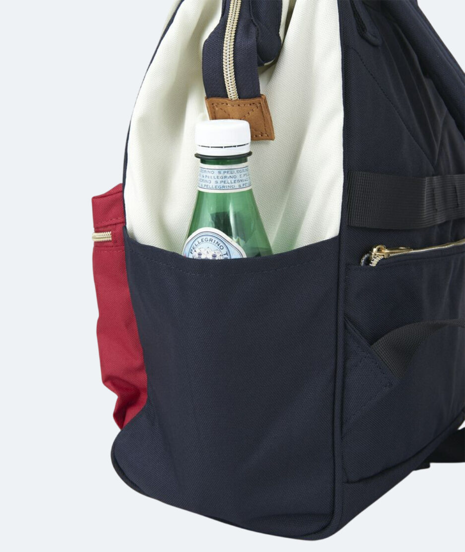 anello Cross Bottle Backpack is now more convenient with PC storage, security pockets, and a D-ring on the side. Features include a magazine holder, bottle holder, trolley sleeve, water resistance, and strong metal clasps, with eco-suede zip tips and decorative metal dots. Designed and quality-checked in Japan.
